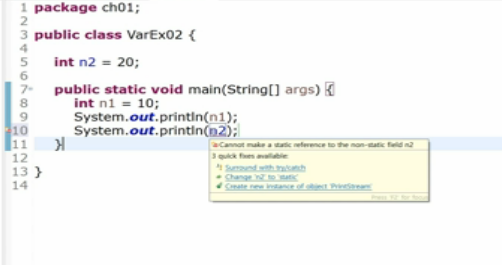 static이 아니라서 n2를 사용할 수 없다고 하네요.