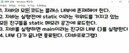 반드시 기억해야할 것이 자바에서 모든 코드는 반드시 클래스 내부에 존재해야 합니다.