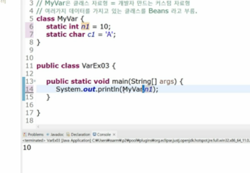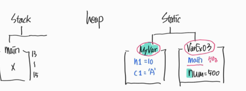 stack에는 main함수가 담기고(13~15번째줄) static에는 MyVar과 VarEx03이 담기고 그 안에는 n1,c1,main이 담기는 것을 확인할 수 있습니다.