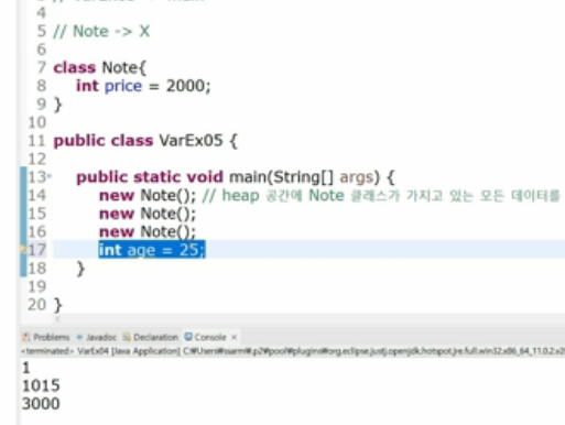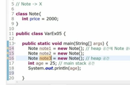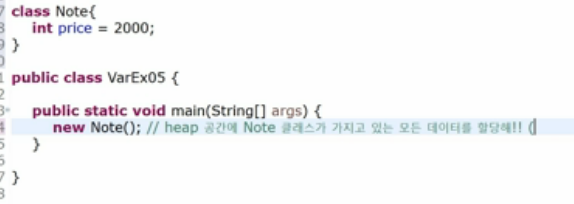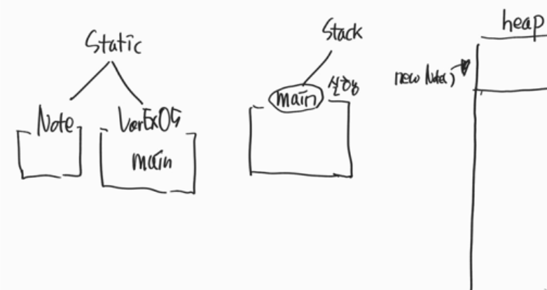 지금 static에는 VarEx05인 main함수가 실행되고 있습니다. 그리고 그 안에 new Note();이렇게 입력하게 되면 heap공간에 Note클래스가 가지고 있는 모든 데이터를 할당하란 뜻이 됩니다.(대신 static이라고 적힌 애들 제외)