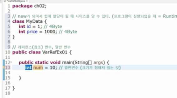 즉, num에 값을 넣지 않고 num만 선언했기 때문에 이것을 변수를 선언했다고 말합니다. 일반변수와 레퍼런스 변수 모두에게 해당됩니다.