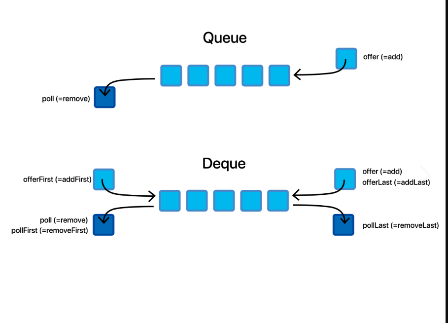 또한 offer(add)는 offerLst(addLast)와 같고 poll(remove)는 pollFirst(removeFIrst)와 같습니다.