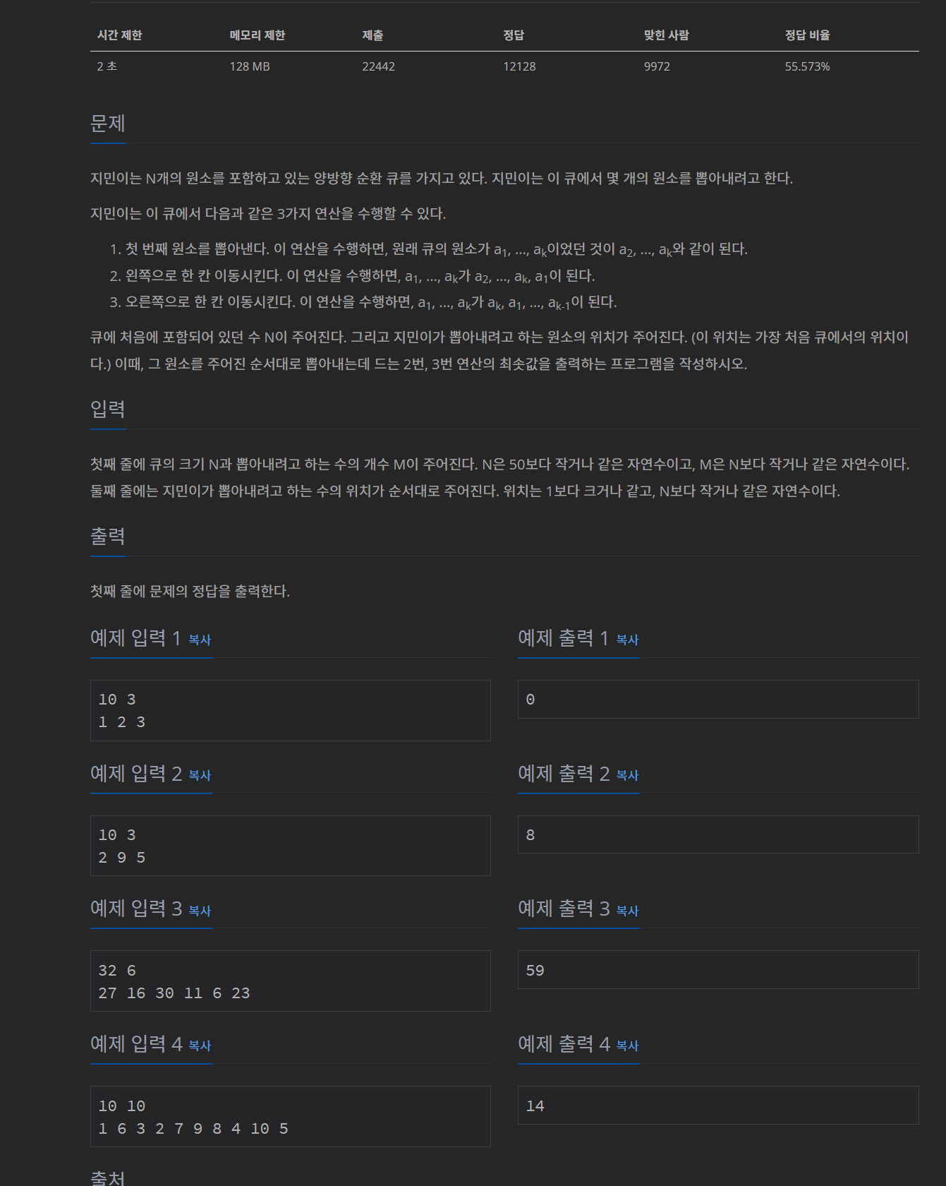 첫째 줄에 큐의 크기 N과 뽑아내려고 하는 수의 개수 M이 주어진다. N은 50보다 작거나 같은 자연수이고, M은 N보다 작거나 같은 자연수이다. 둘째 줄에는 지민이가 뽑아내려고 하는 수의 위치가