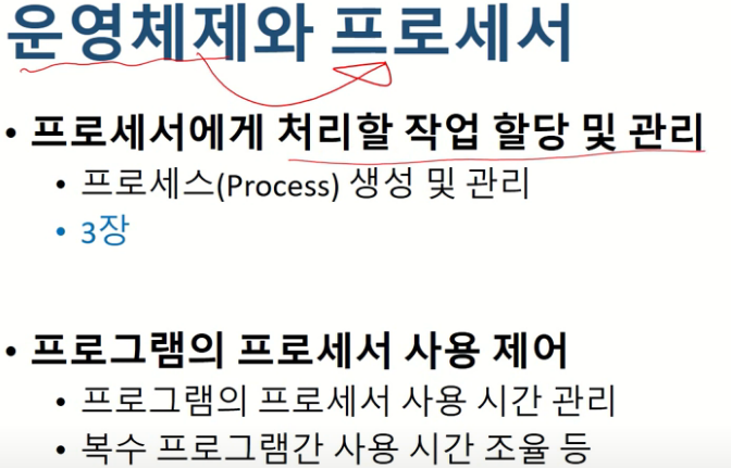 운영체제는 프로세서에게 처리할 작업 할당 및 관리를 하도록 합니다. 앞으로 배울 내용입니다.