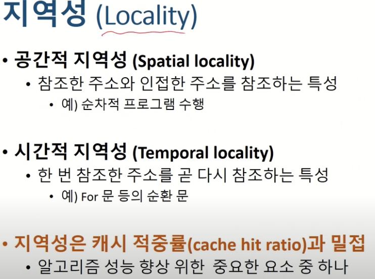 그리고 시간적 지역성(Temporal locality)란 만약 어느 주소를 참조했다면 이 다음에도 또 그 주소를 참조할 가능성이 높다고 이야기하는 것이 시간적 지역성입니다. 주로 for문을 잘 생각해보세요.