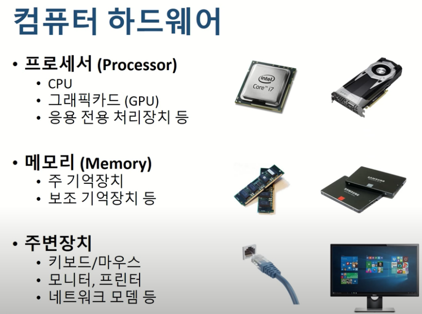 하드웨어는 프로세서, 메모리, 주변장치 총 3가지로 구분할 수 있습니다.
