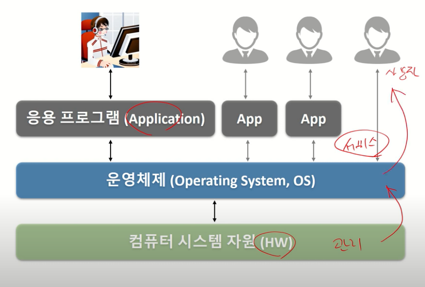 운영체제란 컴퓨터 시스템 자원(하드웨어)를 효율적으로 관리해서 사용자 또는 응용 프로그램들에게 서비스를 제공하는 역할을 합니다.