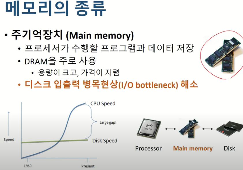 다르게 얘기하자면 디스크까지 가는게 너무 느리기 때문에 성능을 빠르게 하는데 방해현상, 그러니까 병목현상을 해소하기 위해서 메인 메모리를 가운데에 두었다고 생각하시면 되겠습니다.