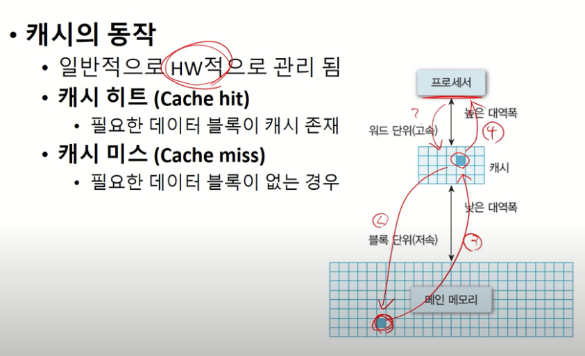 만약에 캐시에 데이터가 있다면 있다고 응답 후(이것을 캐시 히트라고 합니다.) 메인메모리까지 가져가지 않고 그것을 프로세서에 데이터를 줌으로써 가져다 쓸 수 있게끔 도와줍니다.