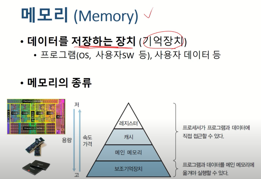 두번째로 메모리라고 있는데, 이것은 주로 데이터를 기억하는데 사용됩니다. 이것 외에도 디스크 등도 메모리에 포함됩니다.