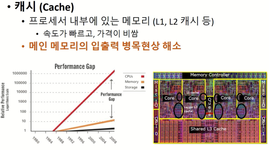 왼쪽 밑의 그래프를 보시면 메모리를 넣었음에도 CPU의 속도와 차이가 점점 벌어지고 있습니다.