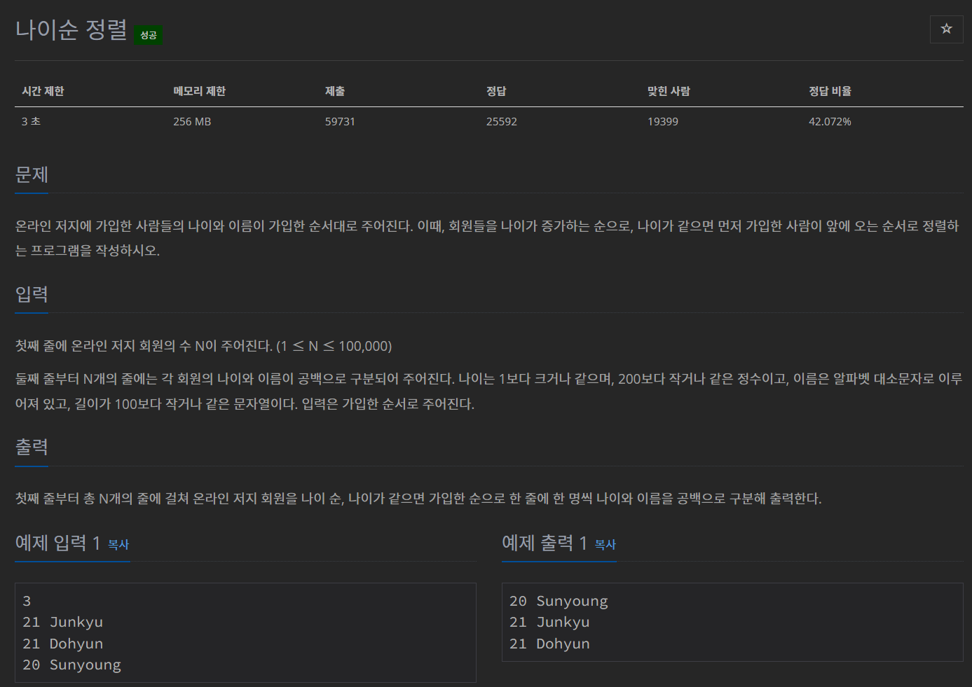 온라인 저지에 가입한 사람들의 나이와 이름이 가입한 순서대로 주어진다. 이때, 회원들을 나이가 증가하는 순으로, 나이가 같으면 먼저 가입한 사람이 앞에 오는 순서로 정렬하는 프로그램을