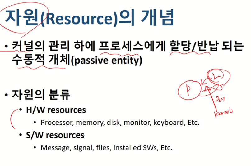 즉 커널의 관리 하에 프로세스에게 할당/반납되는 수동적 개체를 자원(Resource)라고 부릅니다.