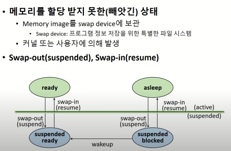 이럴 경우에는 Memory image를 다음에 프로세서에 할당할 수 있을 때 이어서 하기 위해 swap device에 보관하게 됩니다. 일종의 하드디스크라고 생각하시면 됩니다.