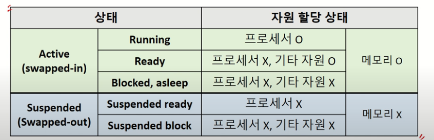 근데 blokced도 됐는데 메모리도 뺏겨서 (I/O 하다가) 이 때를 suspend blocked라고 부릅니다.