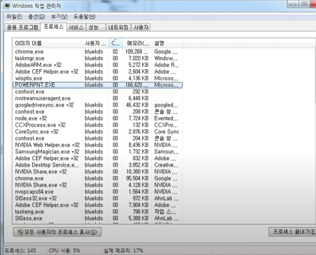 윈도우즈 + Delete를 눌러 작업 관리자를 들어가면