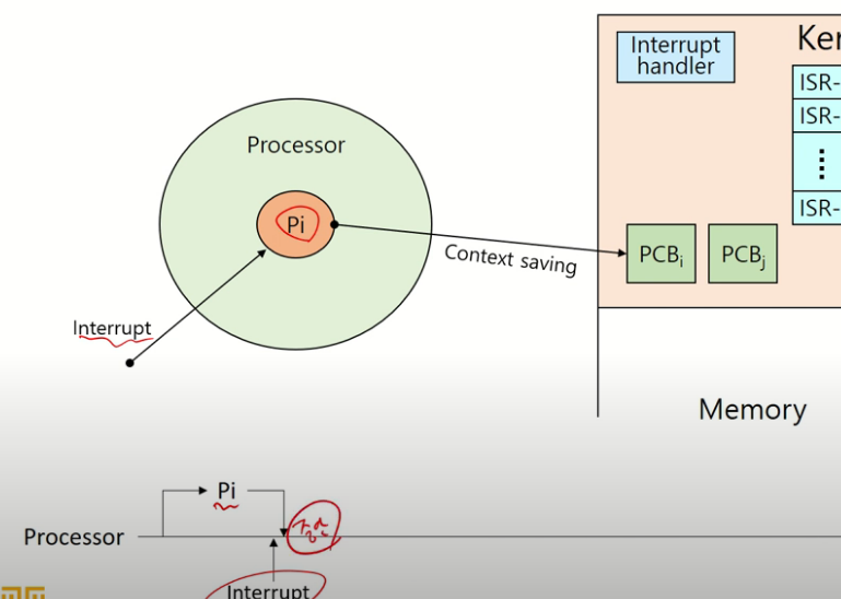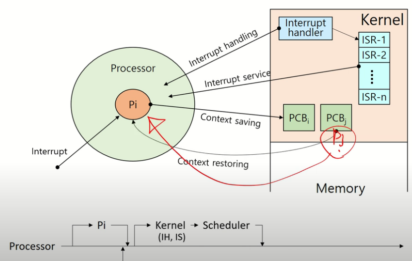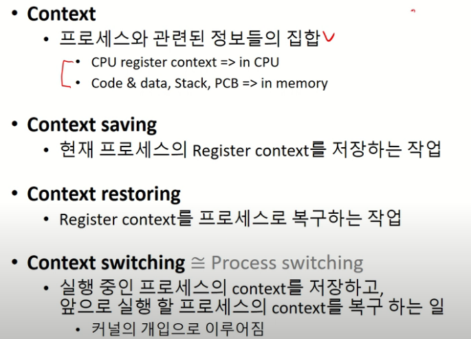 이 때 Context saving이 PCBi자리에 일어나게 되고 그 다음 차례는 Pj가 들어올 때는 저장되어 있던 PCBj가 복구되어야 합니다. 이 때 Context restoring이라고 합니다. 이처럼 실행 중인 프로세스의 context를 저장하고 context를 복구하는 일을 Context Switching이라고 부르며 이것은 커널의 개입으로 이루어집니다.