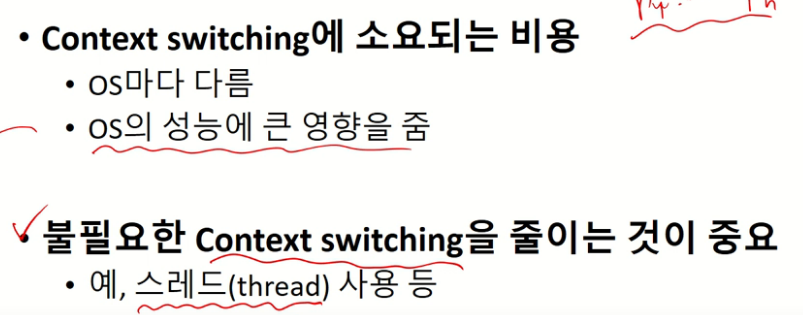 때문에 불필요한 Context Switching을 줄이는 것이 중요하겠으며 이를 위해 스레드(thread)가 존재합니다.