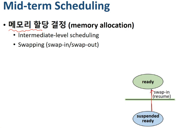 즉, mid-term 스케줄링은 suspended ready 였던 것을 ready상태로 올리는 단계입니다. 그럼 이 ready상태에서 더 나아가서 running상태로 만드는 것도 있겠지요?