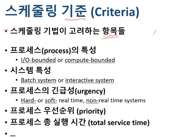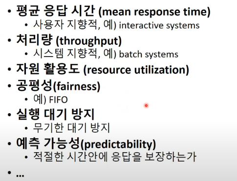 이 스케줄링의 목적 중 성능 향상이라는 것이 있었는데 이 성능을 향상시키는 지표가 굉장히 다양하고 시스템의 목적에 따라 다를 수 있기 때문에 시스템에 맞는 목적을 고려하여 스케줄링을 하는 것이 좋다라고 말씀 드리고 싶습니다.