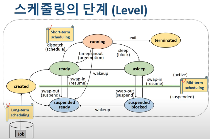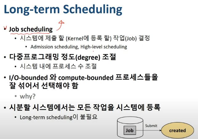 가끔 일어나는 스케줄링인 Long term Scheduling은 Job 스케줄링을 이야기하기도 합니다.