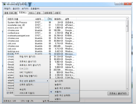 Ctrl + Alt + Delete를 눌러보시면 작업 관리자에서 프로세스의 우선순위를 결정할 수 있습니다.