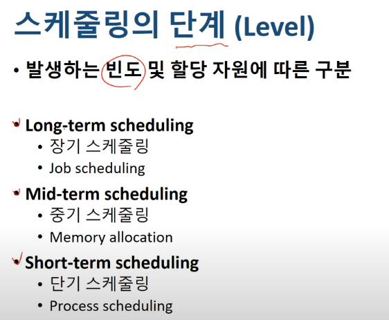 스케줄링의 단계는 발생하는 빈도에 의해 나뉘어 집니다.
