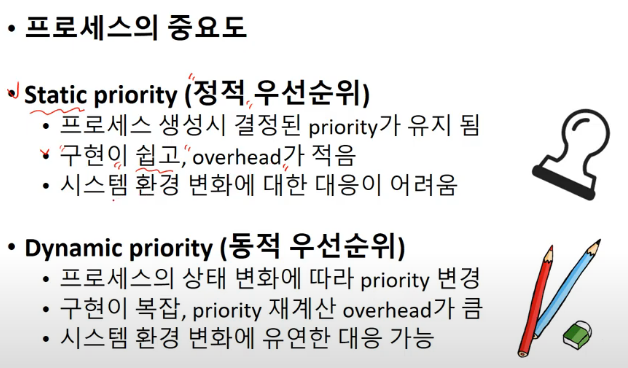 정리하자면 정적 우선순위는 볼펜으로 글씨를 쓴 것이 안지워지고 계속 종이에 남아있는 반면 동적 우선순위는 연필로 작성했을 경우 지웠다 썼다를 반복함으로써 비용이 증가하므로 각기 장단점이 존재한다고 이해할 수 있겠습니다.