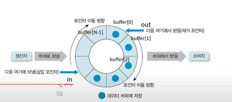 그러므로 P(nrempty)가 0보다 크면 안으로 들어가게 되는데, 내가 놓을 buffer에 물건을 놓고 in의 물건을 (in+1)mod N으로 갱신합니다.