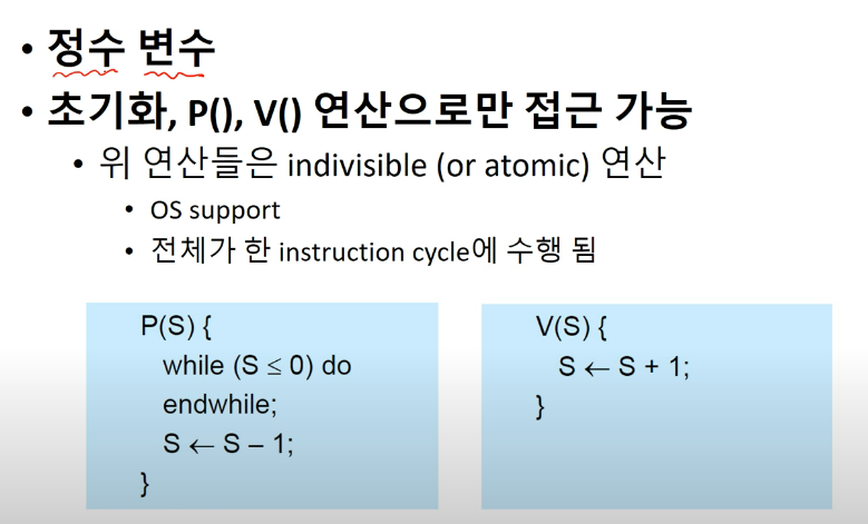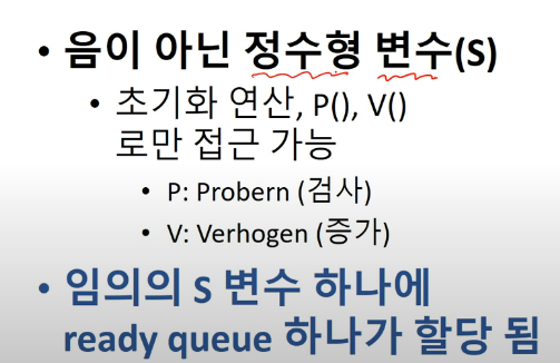 지금까지 했던 것처럼 s = s + 1;같은 연산을 하는 것이 아니라 초기화, P(), V() 연산으로만 접근 가능합니다.