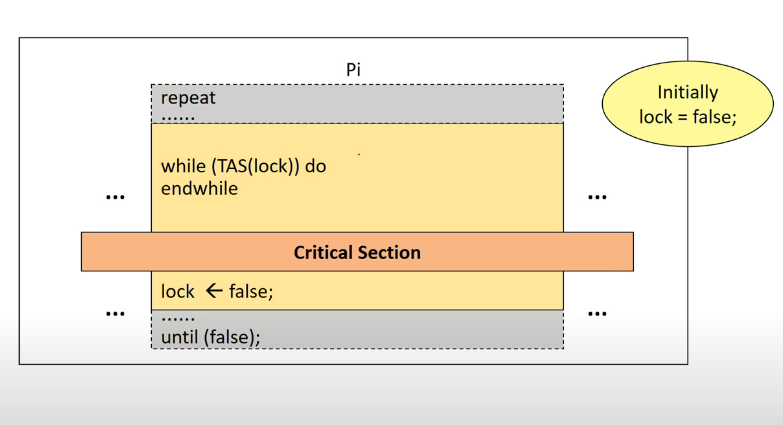 이후, 다른 프로세스인 Pj가 들어왔을 때 똑같이 TAS 명령어를 통해 true가 되고 CS에 들어갈 수 있습니다.