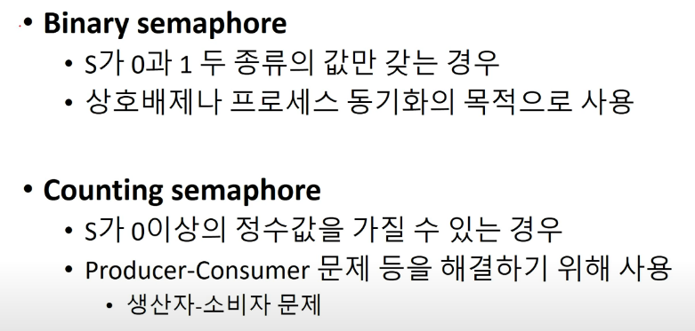 하나는 0과 1의 종류만 가지는 세마포어를 Binary semaphore, 0이상의 정수만 다루는 것을 Counting semaphore라고 합니다.