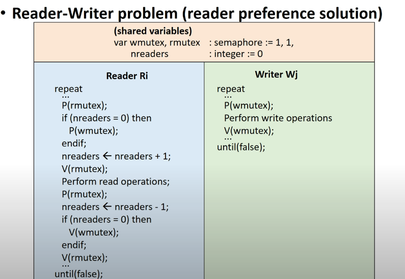 따라서 nreader를 -1 해주고 만약 nreaders가 0이면 V(wmutex)를 실행하는데, wmutex를 0으로 만듭니다.