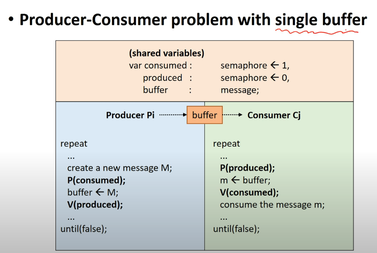 따라서 Pj는 V(sync)를 통해 물건을 반납함으로써 sync는 1이되고 그 때 되어서야 P연산이 실행되어 Pi가 실행됩니다.