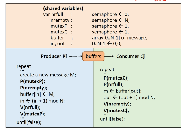 그러므로 P(nrempty)가 0보다 크면 안으로 들어가게 되는데, 내가 놓을 buffer에 물건을 놓고 in의 물건을 (in+1)mod N으로 갱신합니다.