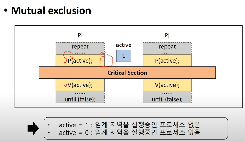 이후 Pj가 들어오고 P가 실행되어 다시 active가 1이되고 CS에 들어가서 일을 하게 됩니다.