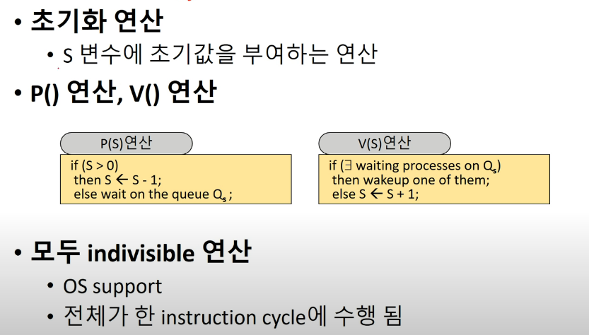 지금까지 했던 것처럼 s = s + 1;같은 연산을 하는 것이 아니라 초기화, P(), V() 연산으로만 접근 가능합니다.