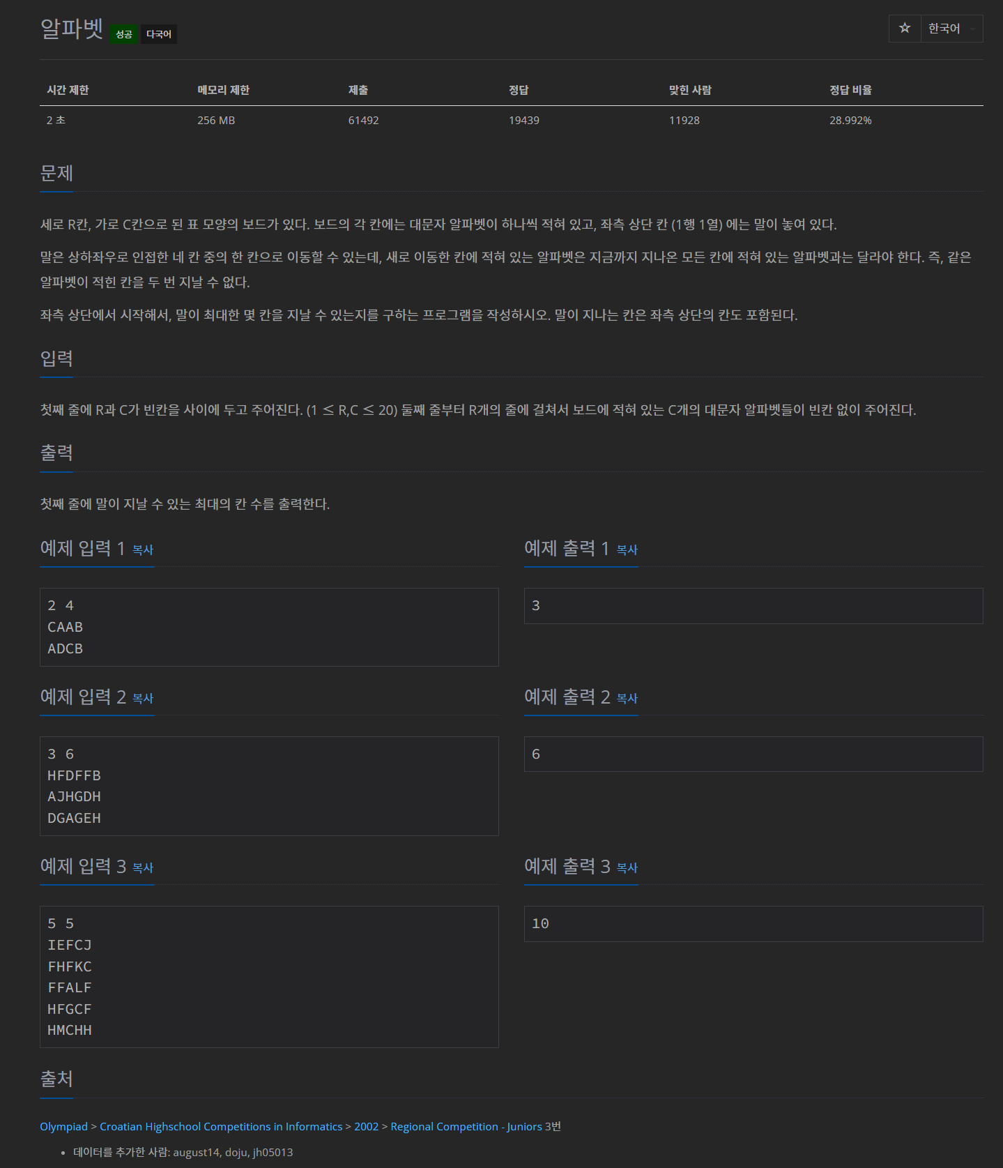 세로 R칸, 가로 C칸으로 된 표 모양의 보드가 있다. 보드의 각 칸에는 대문자 알파벳이 하나씩 적혀 있고, 좌측 상단 칸 (1행 1열) 에는 말이 놓여 있다. 말은 상하좌우로 인접한 네 칸 중의 한 칸으