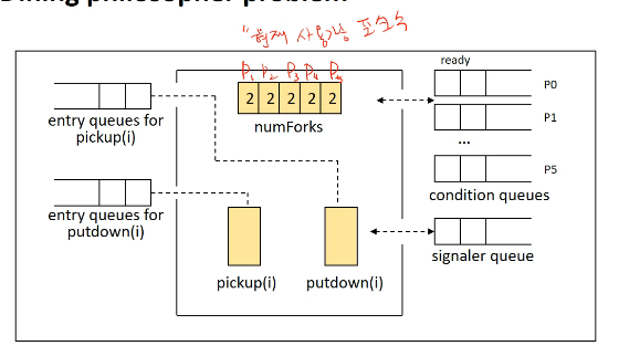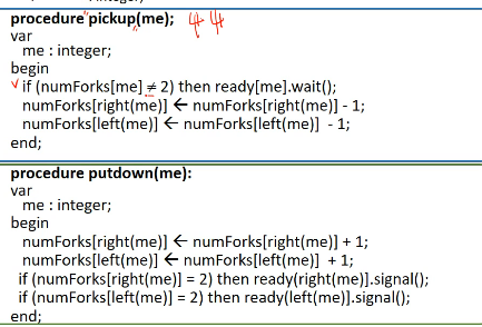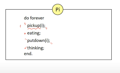 따라서 pickup(i)에서 포크를 집고, 먹고, 포크를 내려놓고, 생각하고 끝내는 메커니즘을 가집니다.