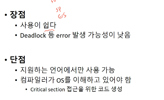 다만, 지원하는 언어에서만 사용할 수 있고 컴파일러가 os를 이해하고 있어야 한다는 단점을 가지고 있습니다. 만약 언어로 이 프로그램을 짜게 된다면 기계어로 번역을 해야하고 이를 컴파일러가 수행합니다. 그런데 컴파일러가 적합한 기계어로 번역을 하려면 os를 이해해야만 가능하기 때문에 어려울 수 있겠습니다.
