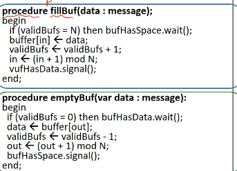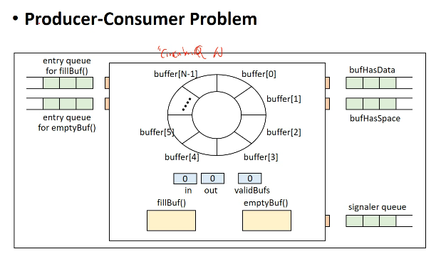 validBufs가 N개라는건 물건이 다 찼다는 것이므로 bufHasSpace에 가서 wait()기다리라는 것입니다.