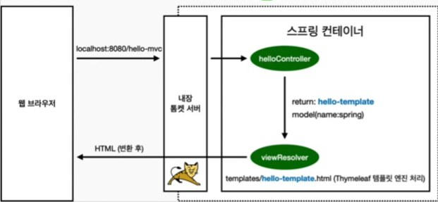 웹 브라우저에서 localhost:8080의 hello-mvc로 넘기면 내장 톰캣 서버를 먼저 거칩니다.