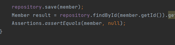 그리고 repository에서 name을 찾을 것이므로 repository.findById라고 입력한 뒤 member.getId()하면 member의 ID를 찾아서 그것에 .get()을 달아주면 id를 얻어옵니다.