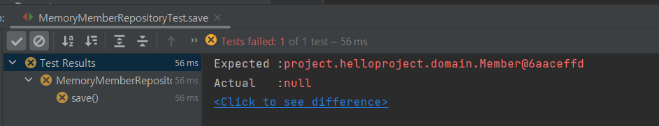 당연히 실제 값과 null은 다르기 때문에 test가 fail 될 것입니다.