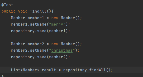 그리고 repository에 member1과 member2를 넣어주고 repository를 모두 찾는 메서드인 findAll()을 시행한 것을 result에 담습니다.
