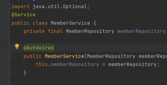 자 그래서 어떻게 해볼거냐면 memberService를 Alt + Shift + Enter를 눌러서 Constructor를 추가합니다.