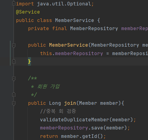 자 왜 컴포넌트 스캔이냐면 MemberService안을 들어가 보겠습니다.