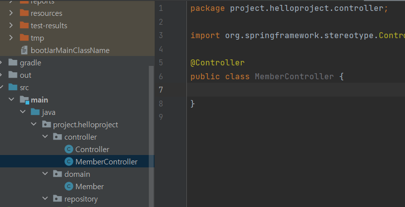 늘 했던 것철엄 controller 패키지에 MemberController라는 클래스를 만들고 어노테이션을 걸었습니다.