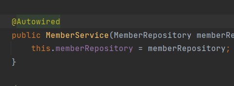 @Autowired라는 어노테이션을 걸어주면 이 MemberService를 스프링이 스프링컨테이너에 있는 MemberService를 찾아서 가져온 뒤 연결을 시켜줍니다.