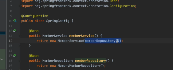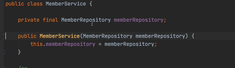 MemberService는 MemberRepository를 사용할 수 있고 (@Autowired 사용할때와 동일하게) 위의 사진처럼 의존성 주입이 일어나게 됩니다.
